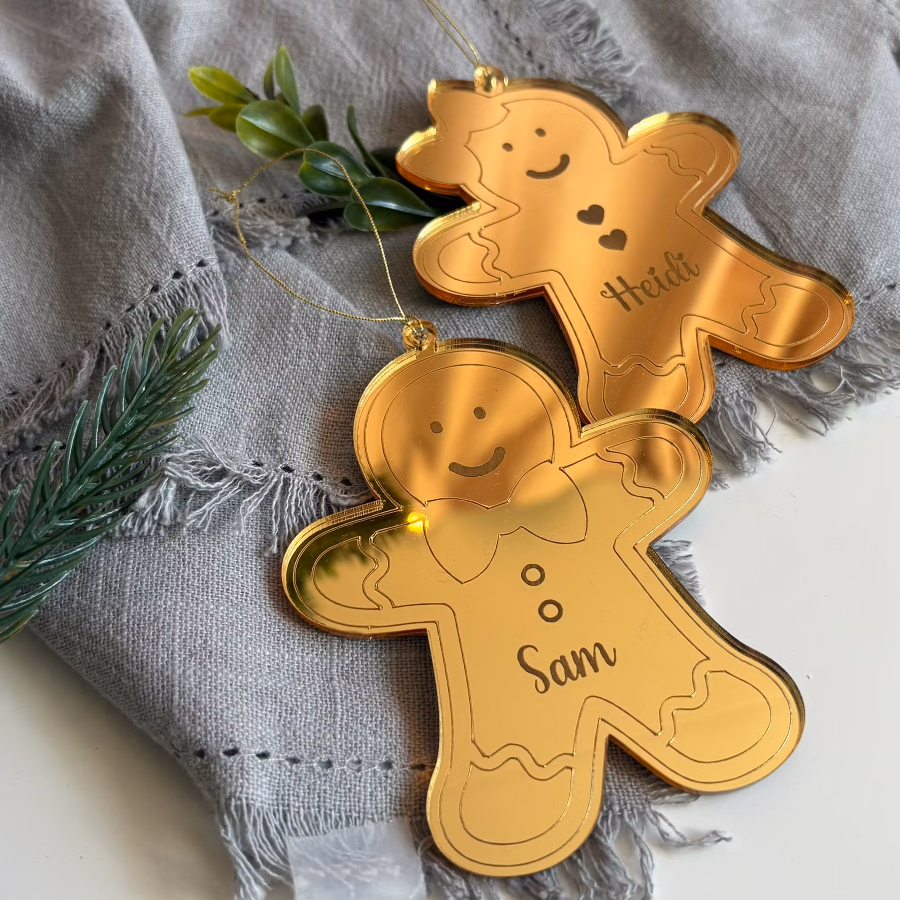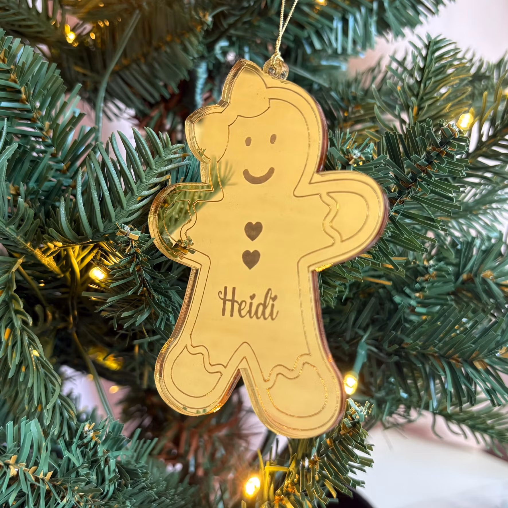 En söt juldekoration i guldspegelakryl i form av en flicka eller pojk pepparkaksgubbe som görs personlig med att ditt val av namn som graveras in.